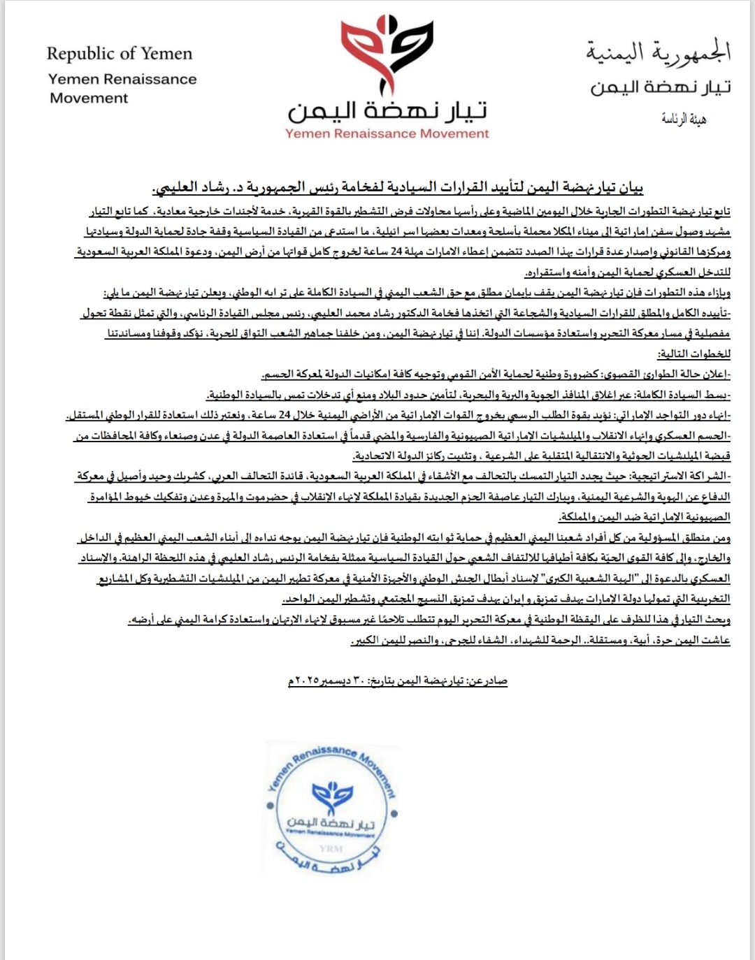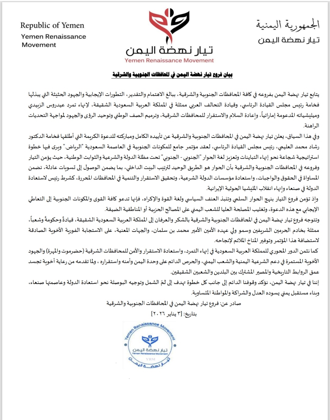 تيار نهضة اليمن هو تيار وطني حداثي ديموقراطي لإنقاذ اليمن من الصراع والفوضى والتطرف والإرهاب, يعمل على تحقيق نهضته انطلاقا من ثوابته المتمثله في النظام الجمهوري والوحدة الوطنية والدولة الاتحادية.