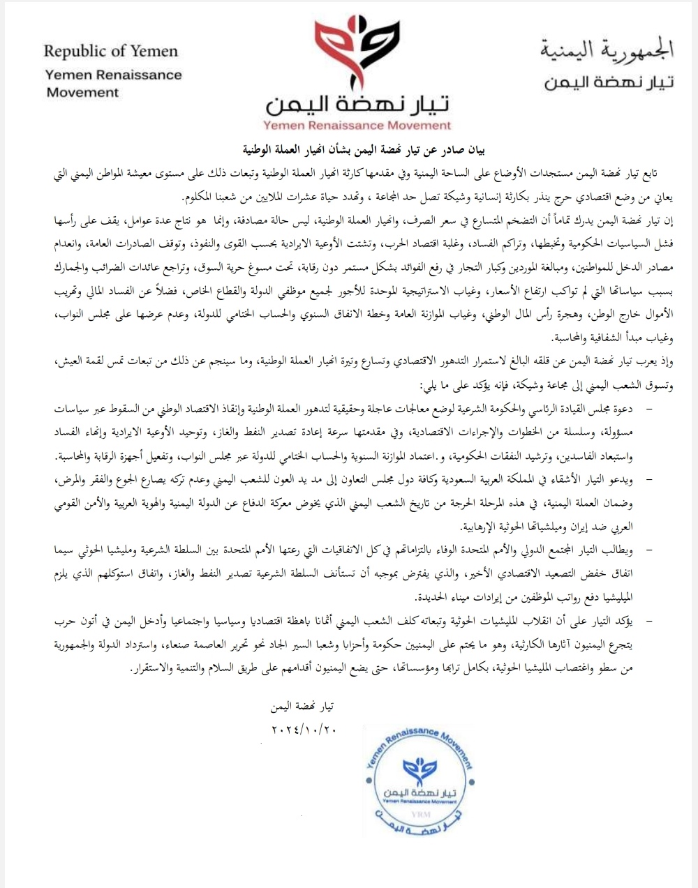 وإذ يعرب تيار نهضة اليمن عن قلقه البالغ لاستمرار التدهور الاقتصادي وتسارع وتيرة انهيار العملة الوطنية، وما سينجم عن ذلك من تبعات تمس لقمة العيش، وتسوق الشعب اليمني إلى مجاعة وشيكة، فإنه يؤكد على ما يلي:
