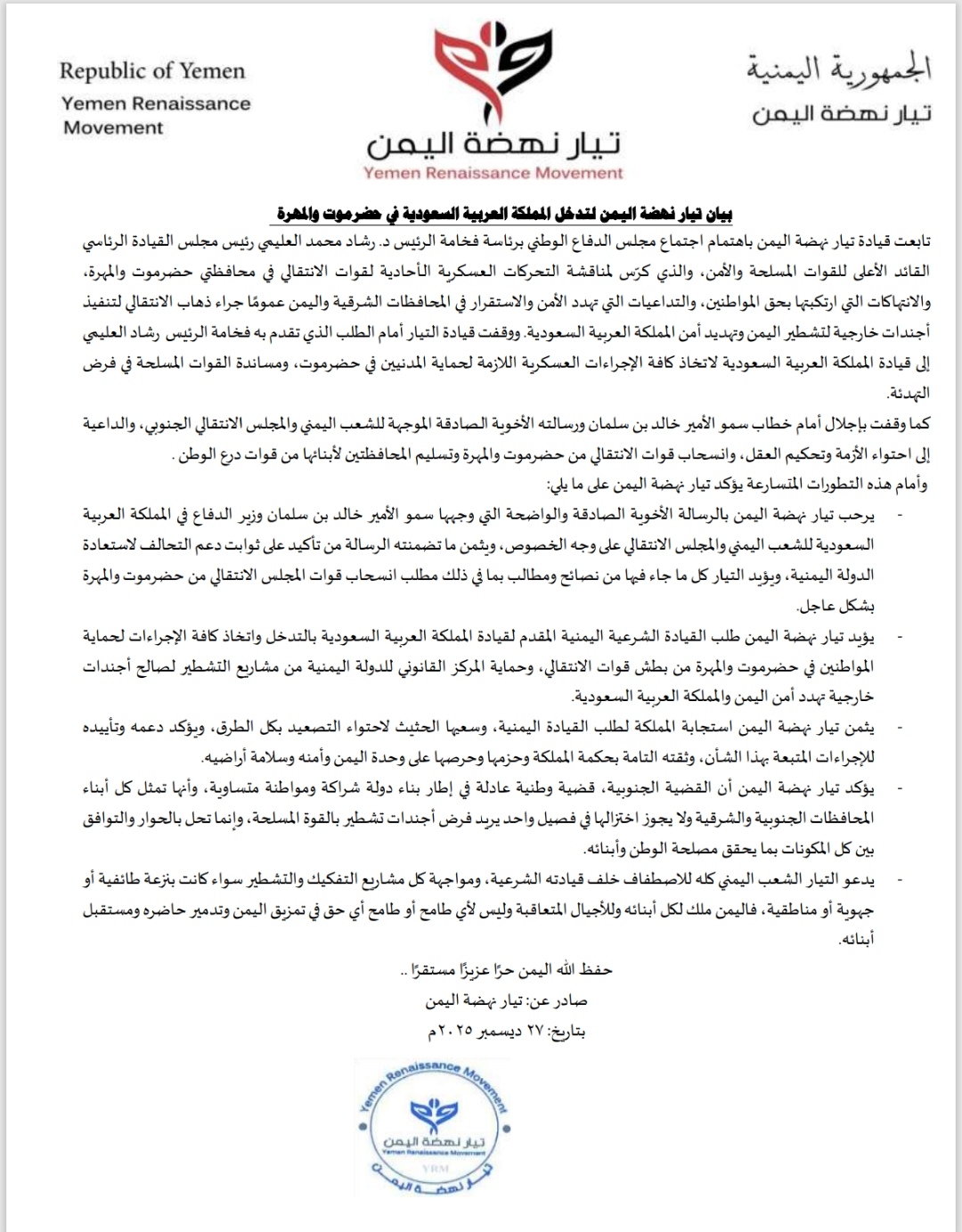 أصدر تيار نهضة اليمن بيان رحّب فيه بتدخل المملكة العربية السعودية الهادف إلى حماية المدنيين واحتواء التصعيد في محافظتي حضرموت والمهرة، وذلك على خلفية التطورات العسكرية الأخيرة.