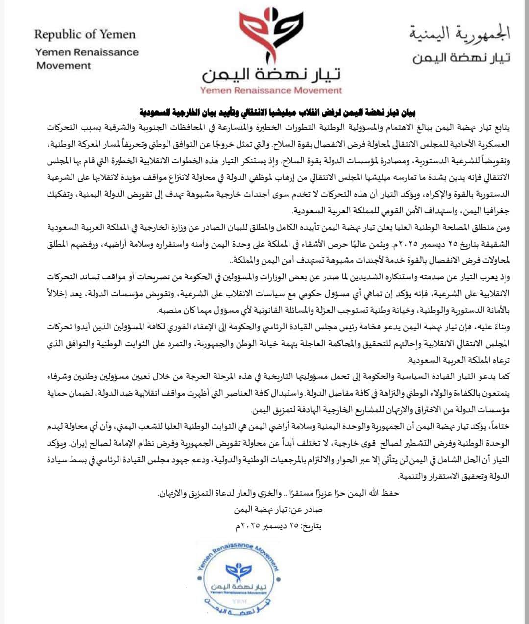 وأعلن تيار نهضة اليمن تأييده الكامل والمطلق للبيان الصادر عن وزارة الخارجية في المملكة العربية السعودية الشقيقة، مثمنًا موقفها الداعم لوحدة اليمن وأمنه واستقراره، ورفضها لمحاولات فرض الانفصال بالقوة، ومؤكدًا أن هذا الموقف يجسد حرص المملكة على حماية التوافق الوطني ومنع انزلاق الأوضاع نحو الفوضى.