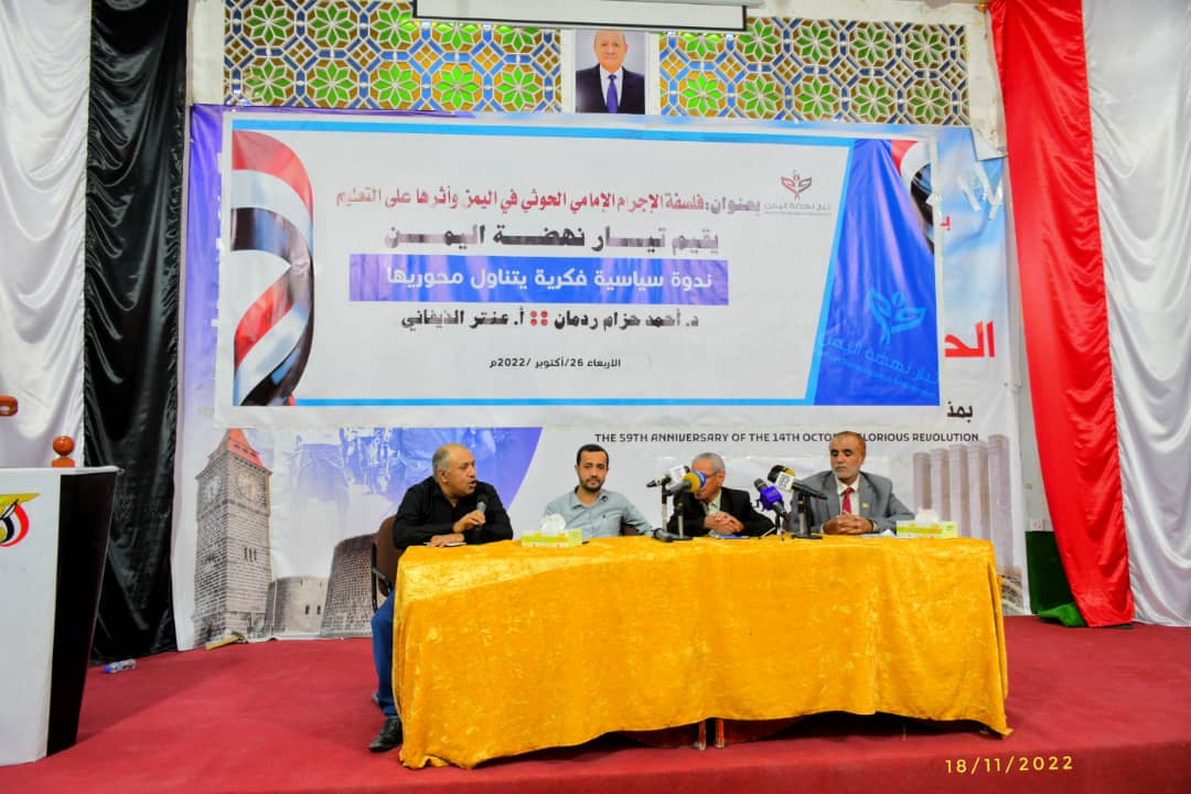 نظم تيار نهضة اليمن بمحافظة مأرب صباح اليوم ندوة فكرة بعنوان (فلسفة الاجرام الامامي الحوثي في اليمن وأثرها على التعليم).