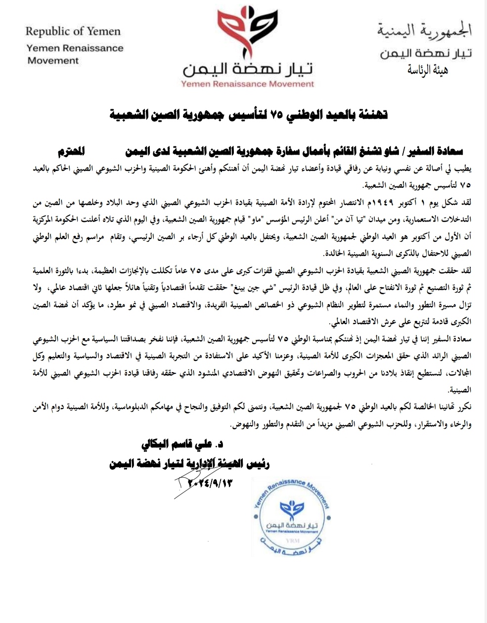 يطيب لي أصالة عن نفسي ونيابة عن رفاقي قيادة وأعضاء تيار نهضة اليمن أن أهنئكم وعبركم نهنئ فخامة الرئيس شي جين بينغ والأمة الصينية بمناسبة العيد الوطني 75 لتأسيس جمهورية الصين الشعبية.