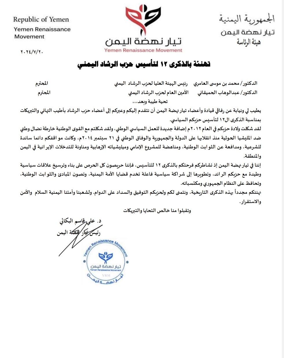 يطيب لي ونيابة عن رفاقي قيادة وأعضاء تيار نهضة اليمن أن نتقدم إليكم وعبركم إلى أعضاء حزب الرشاد بأطيب التهاني والتبريكات بمناسبة الذكرى ال12 لتأسيس حزبكم السياسي.