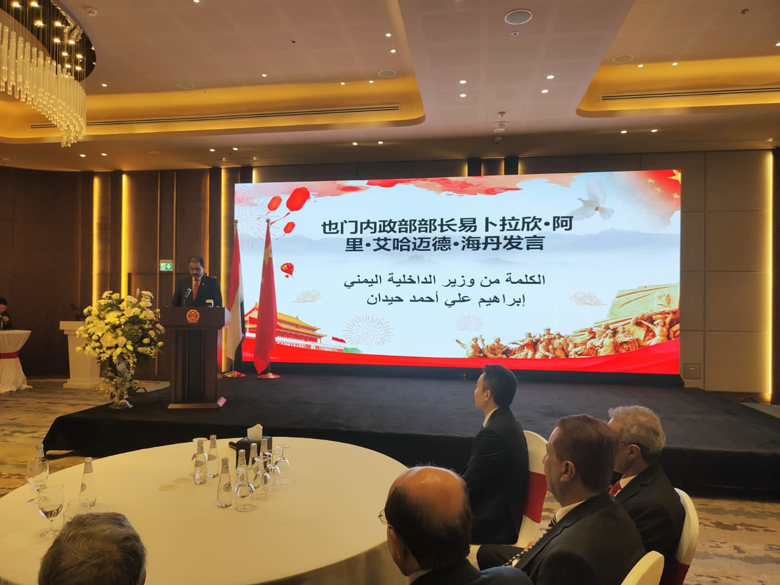 من جهته شكر وزير الداخلية اللواء ابراهيم حيدان الدعوة الصينية مشيدًا بعمق العلاقات اليمنية الصينية منذ أكثر من ٦٧ عام وهي في تطور مستمر مؤكدًا حرص القيادة السياسية في البلدين على تطوير العلاقات بما يحقق المصالح المشتركة والمنافع المتبادلة بين الشعبين الصديقين مثمنًا الموقف الصيني الداعم للحكومة الشرعية وسعيها لتحقيق السلام والاستقرار في اليمن.